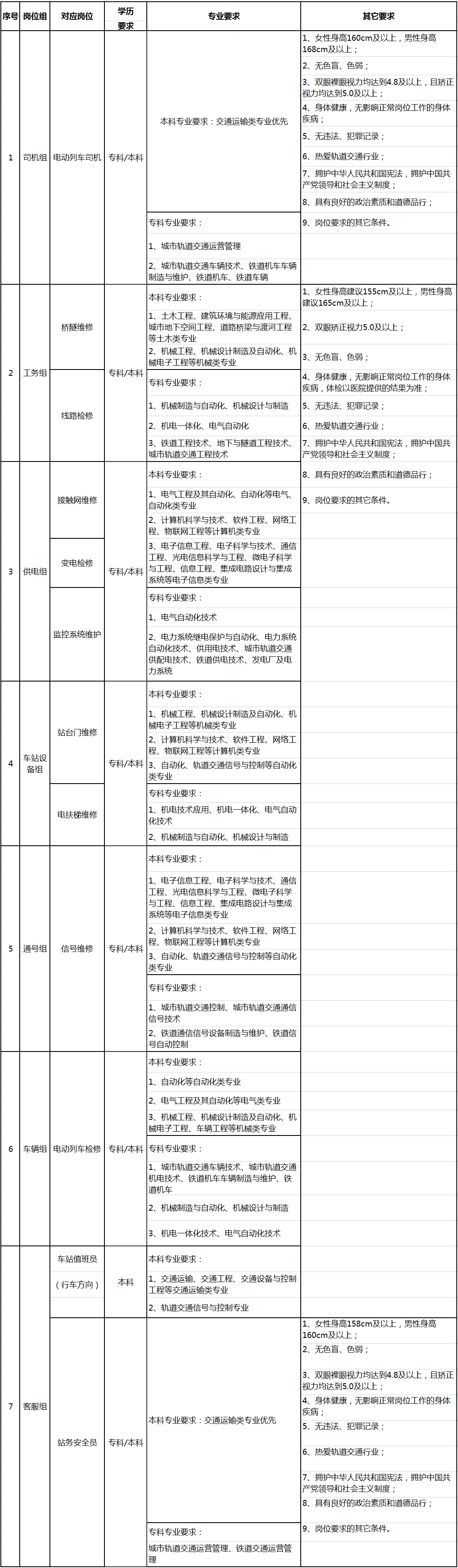 根據(jù)軌道交通建設(shè)、運(yùn)營(yíng)、經(jīng)營(yíng)需要,誠(chéng)招以下專(zhuān)業(yè)2020屆國(guó)家統(tǒng)招普通全日制專(zhuān)科及以上畢業(yè)生。